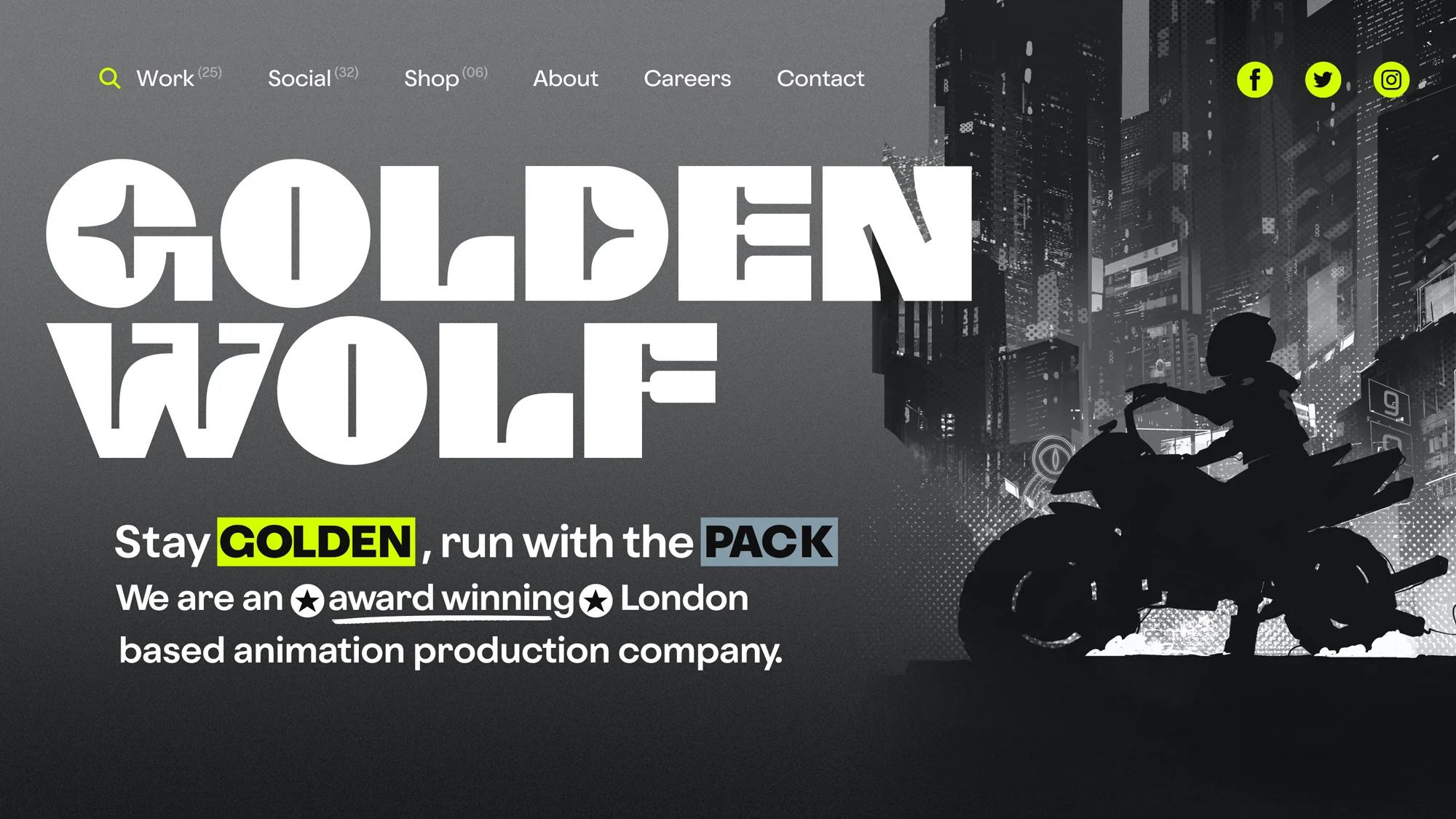 Stay golden, run with the packGolden Wolf is an Emmy nominated animation studio founded in 2013 with offices in London and New York. Their work lives in the space between irreverent humour, intensely dynamic action and psychedelia with clients such as Nike, Facebook, Gatorade, Disney and Adult Swim.